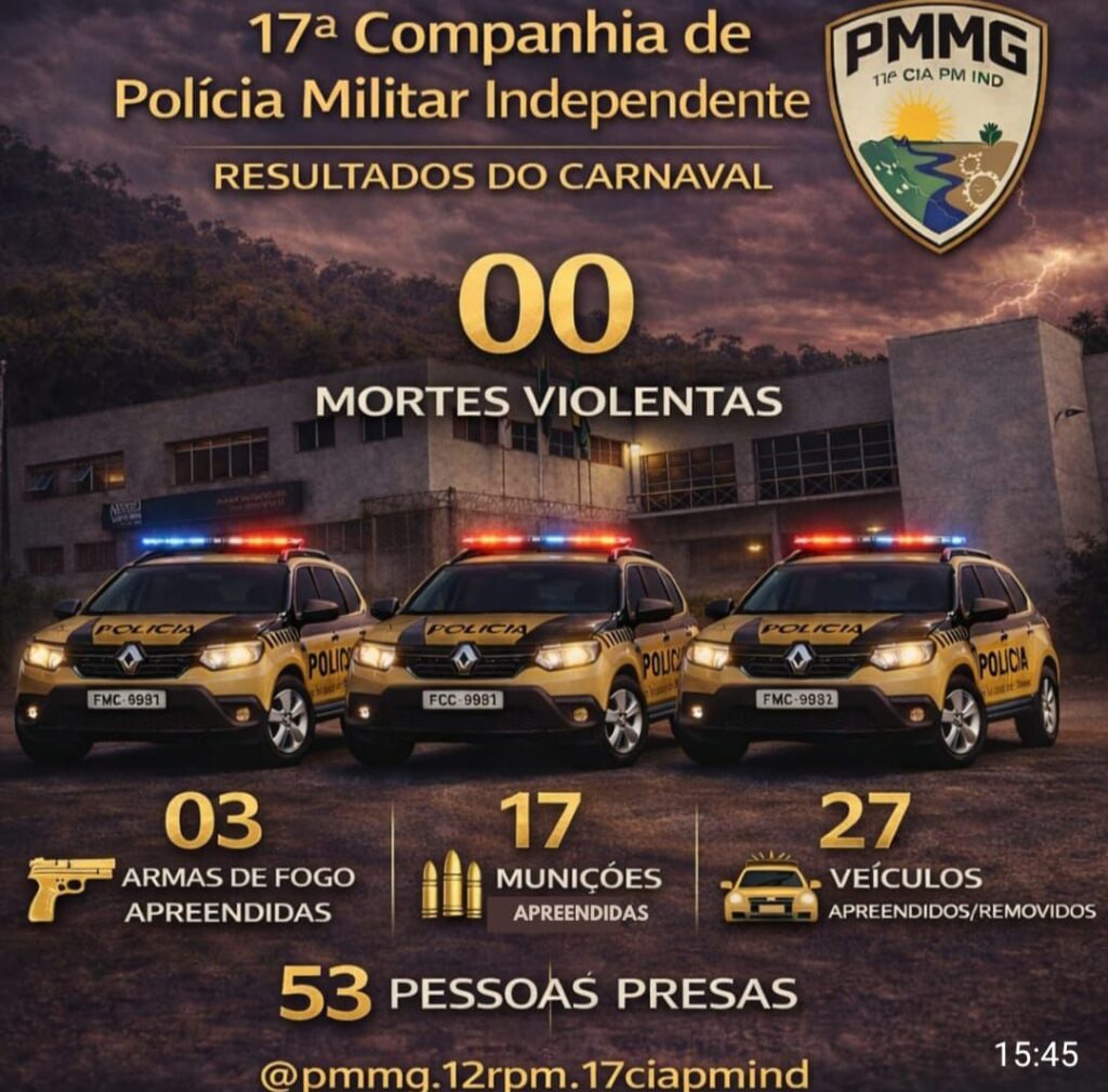 Durante o período carnavalesco de 2026, a Polícia Militar, por meio da 17ª Companhia de Polícia Militar Independente, de João Monlevade, realizou uma operação estratégica com reforço do policiamento ostensivo a pé e motorizado, além do emprego de equipes especializadas e do uso de tecnologias de videomonitoramento e reconhecimento facial em toda a área de atuação da unidade.