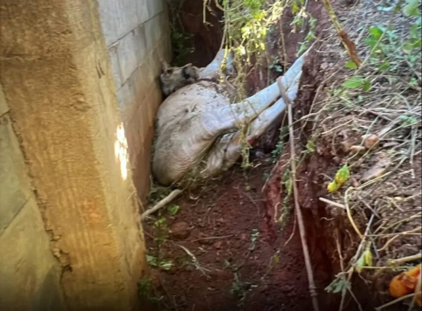 Ao chegarem ao local, os militares avaliaram a situação e, com apoio de moradores, realizaram a abertura de espaço no terreno para viabilizar o resgate. Foram utilizadas cordas presas às patas do animal e tábuas de madeira para facilitar a retirada com segurança.