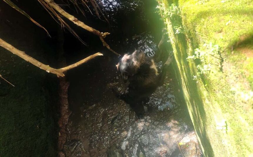 Segundo informações, populares ouviram o animal latindo em meio a uma área de vegetação alta, próxima a uma canaleta de escoamento de esgoto.