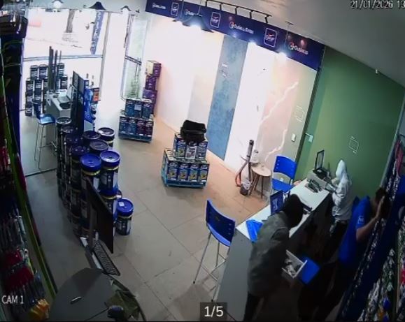 Enquanto a funcionária era mantida sob ameaça, o segundo envolvido, que trajava moletom branco, calça preta e chinelos, revirava o interior da loja em busca de dinheiro e outros objetos de valor.