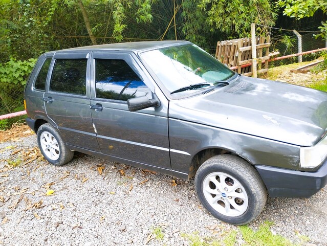 Segundo as informações, trata-se de um FIAT Uno Mille EX, ano 2000, quatro portas, de cor cinza.