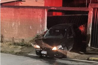 Carro bate em poste e muro após motorista perder controle no bairro Lucília em João Monlevade