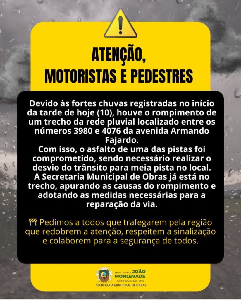 As fortes chuvas que caíram na tarde desta terça-feira (10), em João Monlevade, causaram prejuízos e destruição em alguns pontos do município. Na avenida Armando Fajardo, houve o rompimento de parte da rede pluvial, comprometendo parte da via, sendo necessário desviar o trânsito para meia pista no local.