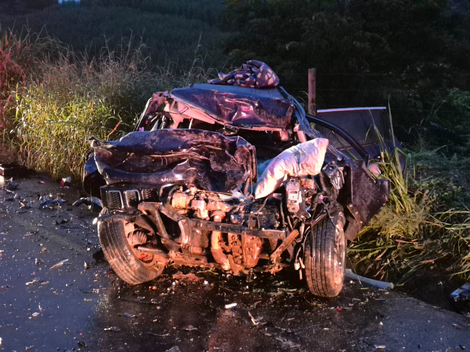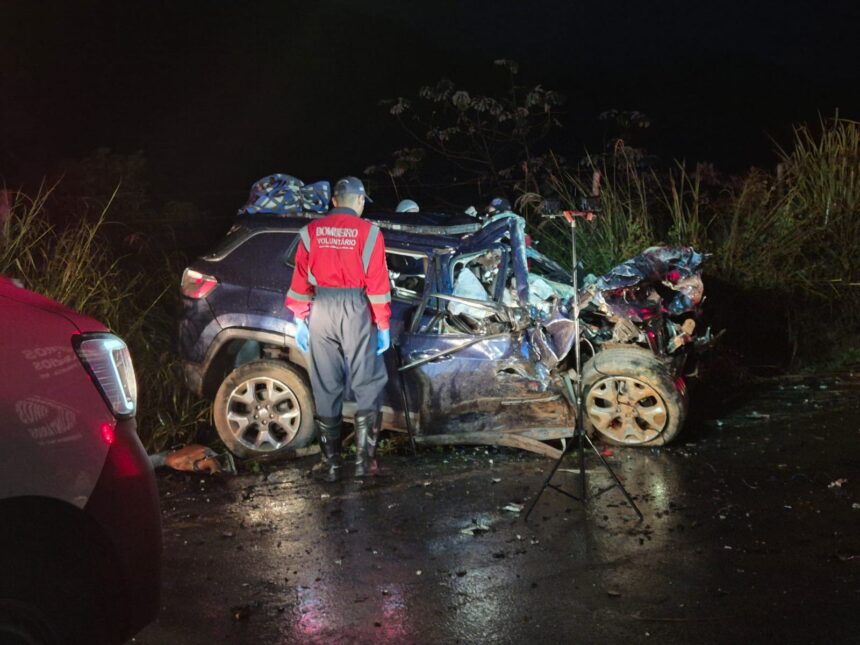 O acidente, registrado por volta das 04h, envolveu um Jeep Compass e um caminhão-tanque em um trecho situado a aproximadamente 2 quilômetros do trevo de São José do Goiabal.