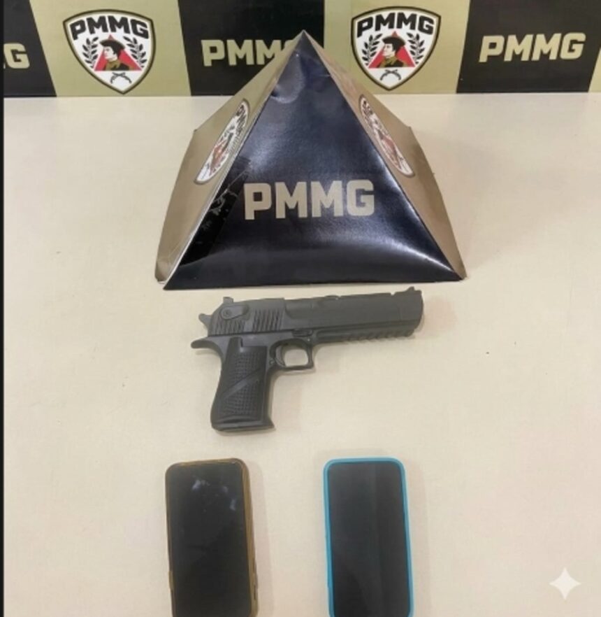 Durante a ação, a Polícia Militar apreendeu um simulacro de arma de fogo e dois aparelhos celulares, ambos modelos iPhone 11.