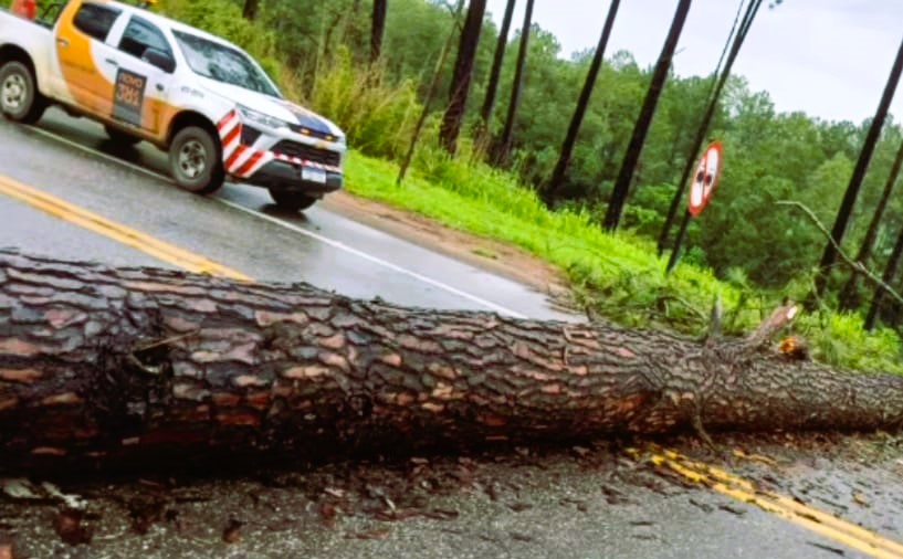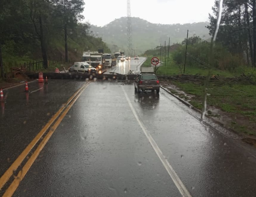 No local, uma árvore caiu sobre a pista, provocando a interdição total da rodovia nos dois sentidos.