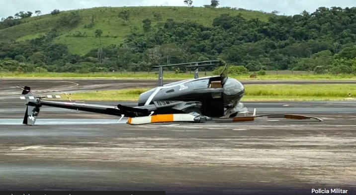 A Polícia Militar (PM) foi chamada ao aeroporto para registrar um caso de queda de aeronave. Mas, no local, os militares encontraram o helicóptero danificado, vazando combustível, mas não havia ocupantes.