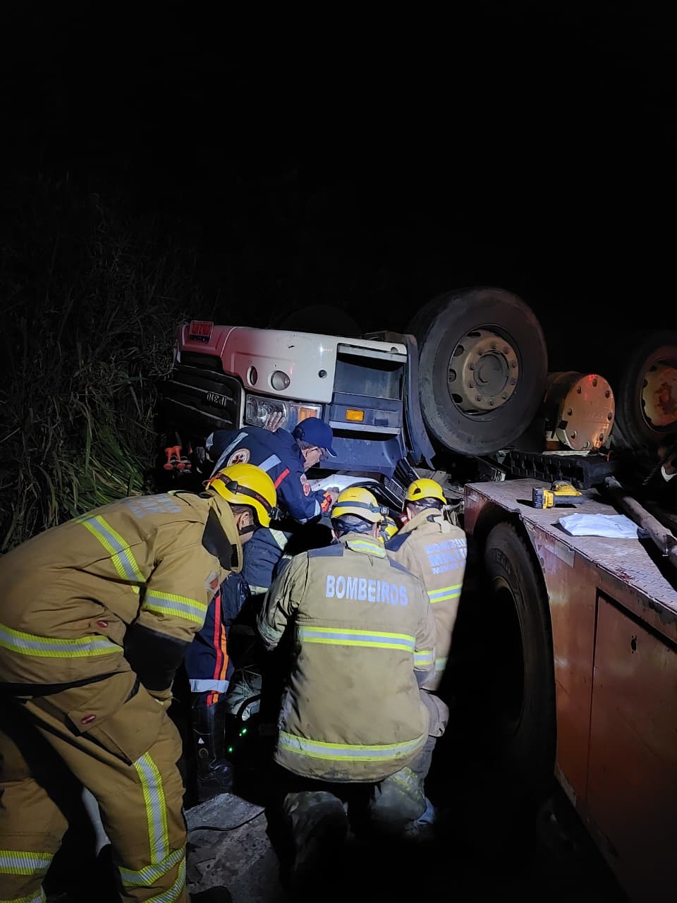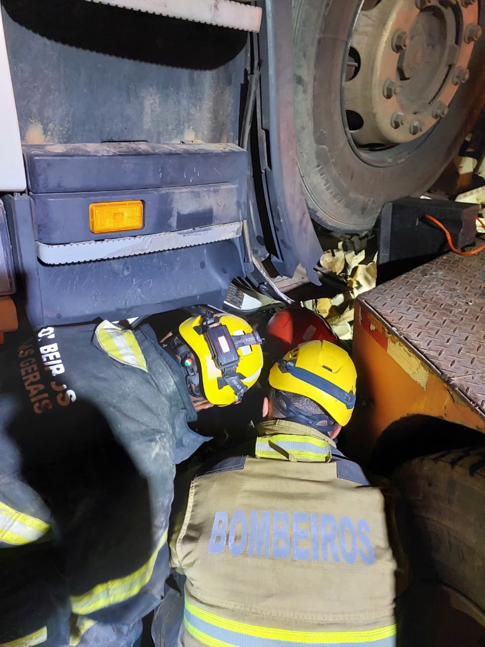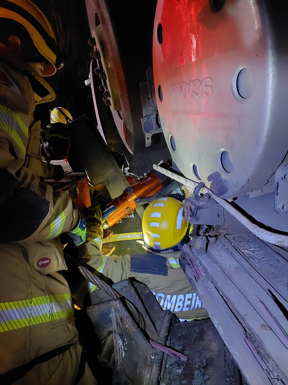 O motorista foi encontrado com vida, mas a forte compressão da estrutura impedia o uso imediato de ferramentas hidráulicas de corte (desencarceradores).