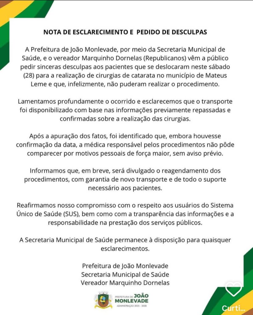 O mutirão de cirurgias foi articulado pelo vereador Marquinhos Dornelas. Em nota, a Prefeitura de Monlevade pediu desculpas pelo ocorrido, dizendo que a médica responsável pelo procedimento não compareceu por motivos pessoais. Entretanto, não divulgou qualquer nota ou vídeo da médica comprovando que a mesma teria se omitido quanto ao atendimento.