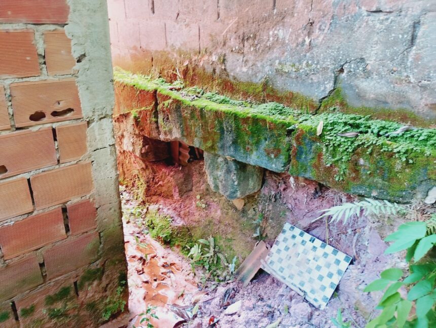 Segundo os bombeiros, foi identificado que uma casa localizada em nível superior possui calhas e sistema de drenagem pluvial direcionando água diretamente para o barranco, o que aumenta a saturação do solo e contribui para o agravamento da instabilidade do terreno.